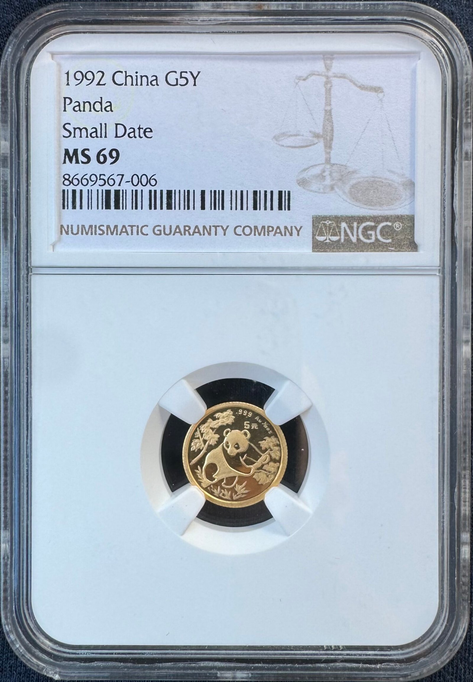 1992 Gold Panda 1/20 oz. 5 Yuan Small Date NGC MS69